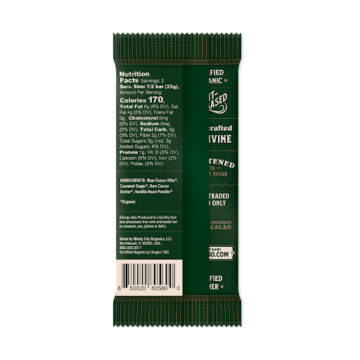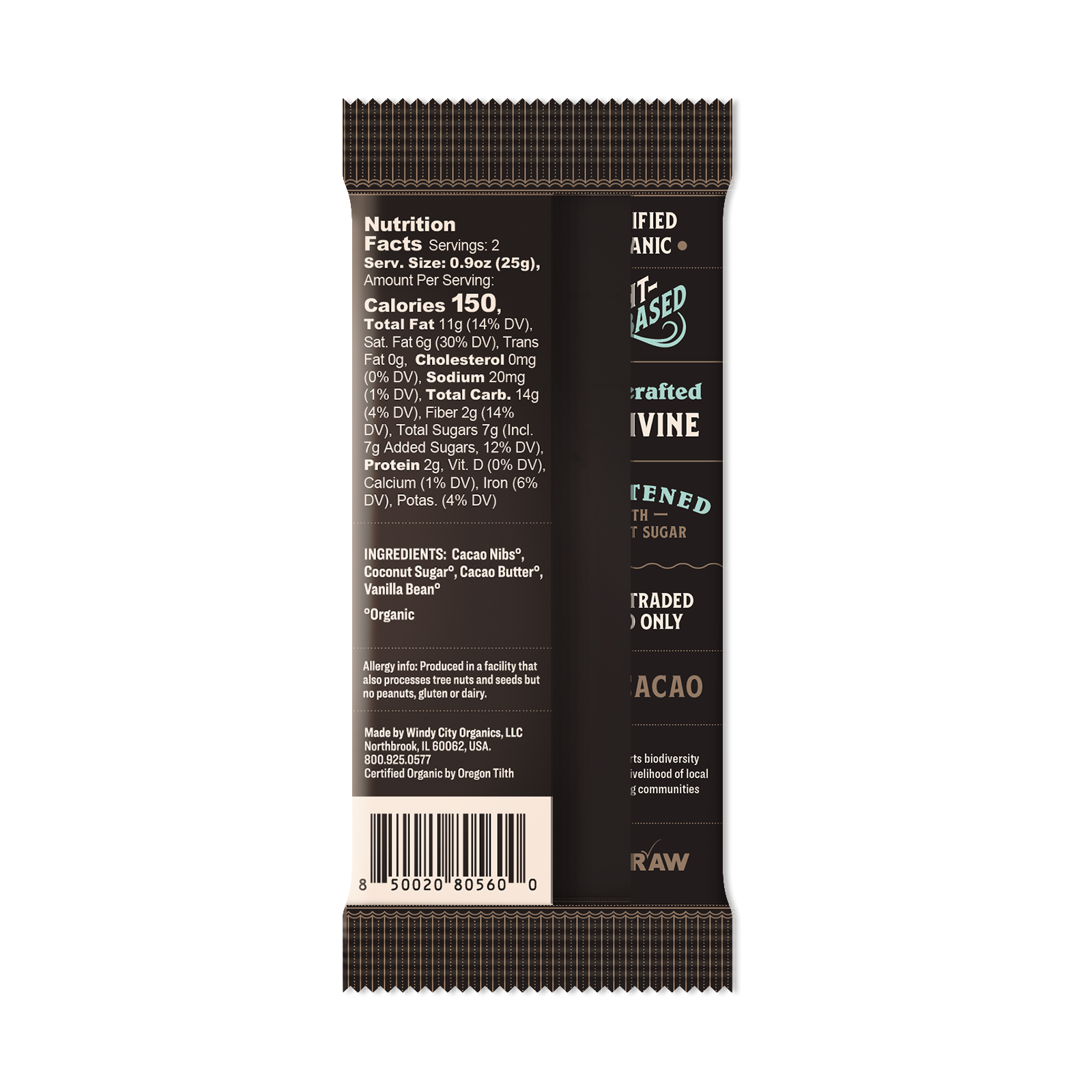 Raw Cacao Nibs°, Coconut Sugar°, Raw Cacao Butter° , Vanillla Bean Powder°.