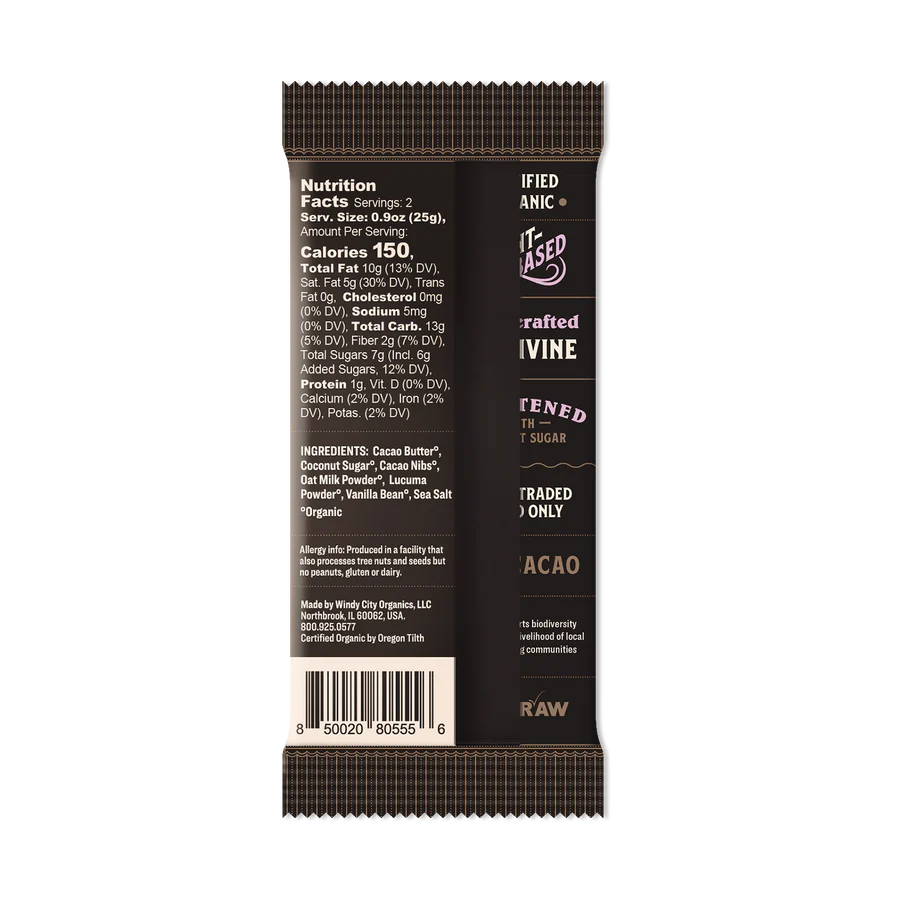 Raw Cacao Butter°, Coconut Sugar°, Raw Cacao Nibs°, Oat Milk Powder°, Lucuma Powder°, Vanillla Bean Powder°, Sea Salt.