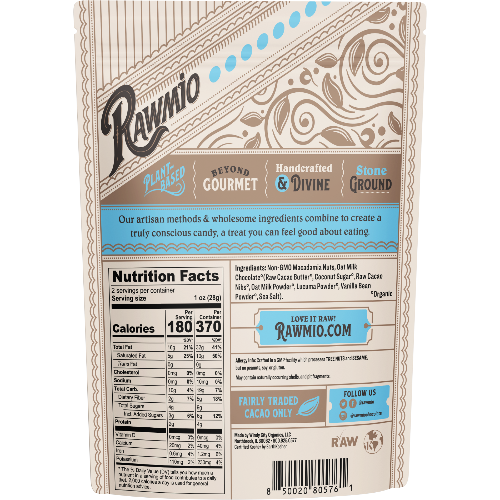 Macadamia Nuts°, Oat Milk Chocolate°(Raw Cacao Butter°, Coconut Sugar°, Raw Cacao Nibs°, Oat Milk Powder°, Lucuma Powder°, Vanillla Bean Powder°, Sea Salt).