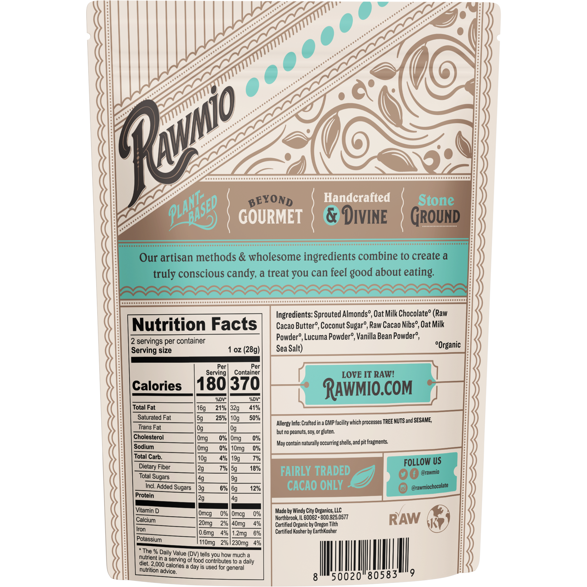 Sprouted Almonds°, Oat Milk Chocolate° (Raw Cacao Butter°, Coconut Sugar°, Raw Cacao Nibs°, Oat Milk Powder°, Lucuma Powder°, Vanillla Bean Powder°, Sea Salt).