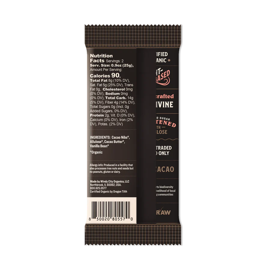 Cacao Nibs°, Allulose°, Cacao Butter°, Vanilla Bean°.