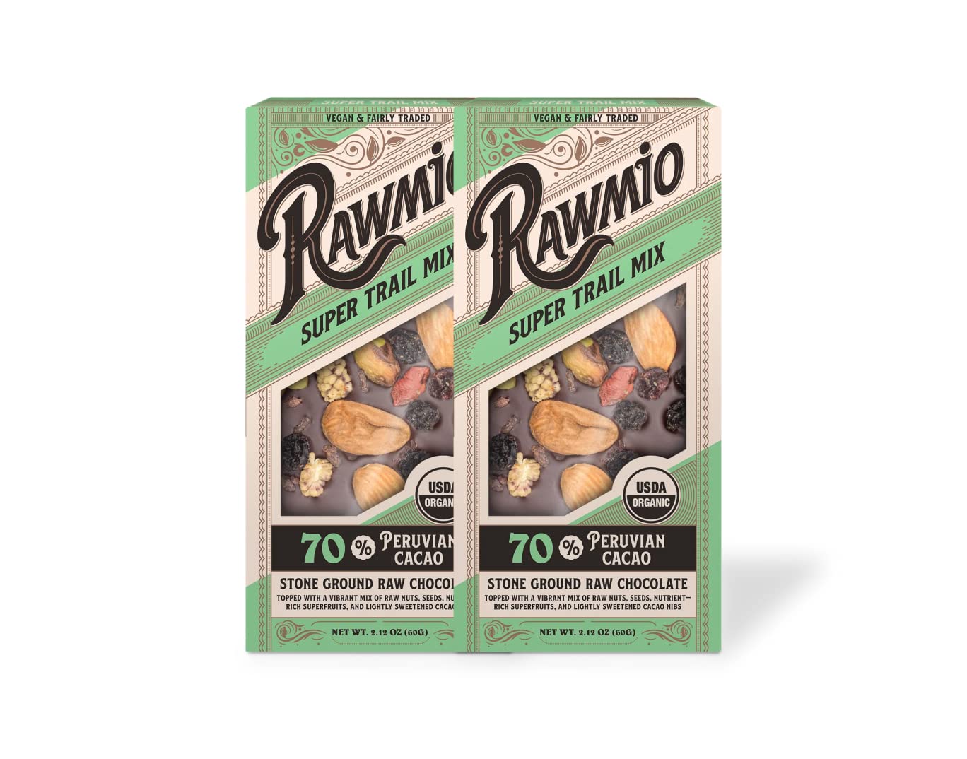 70% stone ground raw chocolate topped with a vibrant mix of raw nuts, seeds, nutrient-rich superfruits, and lightly sweetened cacao nibs.